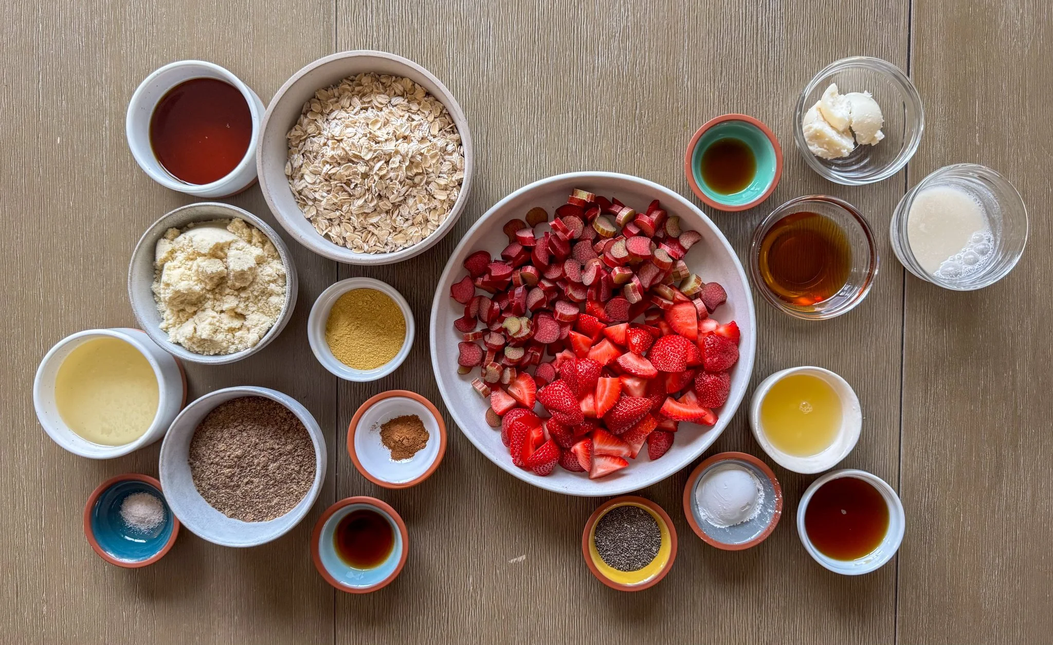 Now, let’s move on to the filling. The combination of strawberries and rhubarb creates a nice balance of sweet and tart. Strawberries provide vitamin C, which is always a plus for your immune system during the postpartum period. Rhubarb adds a nice tang that complements the sweetness of the strawberries. Cooking them together with a bit of lemon juice and maple syrup not only enhances the flavor but also makes a filling that’s satisfying and nutritious. Don’t forget the chia seeds—they add fiber and omega-3s as well.